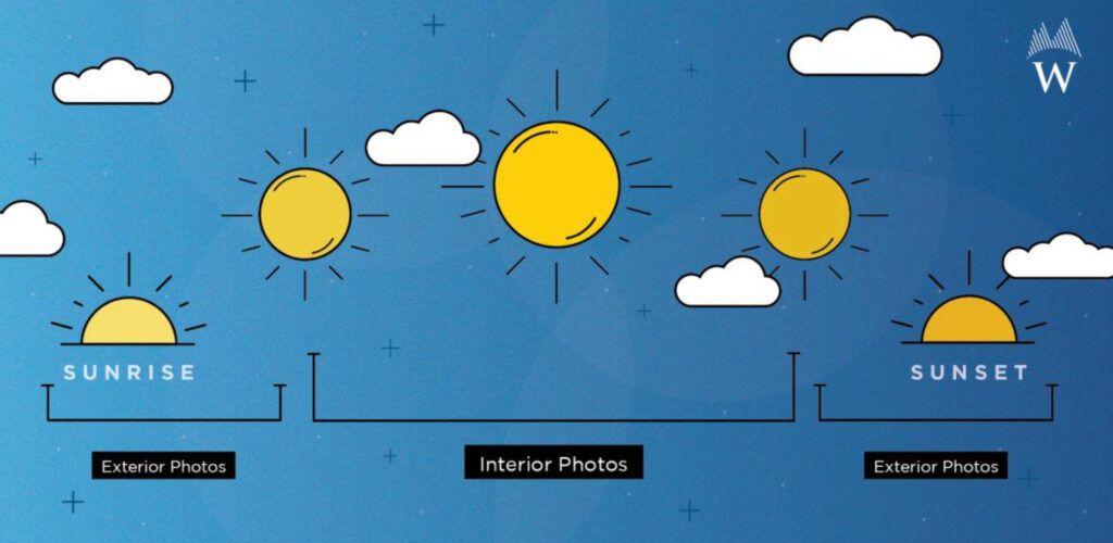 The two hours immediately following sunrise and the two hours immediately before sunset are the optimal times to photograph property exteriors. During these hours, the sunlight is soft and even. The most difficult time of the day to shoot is midday when the sun is at the highest point in the sky because it casts very harsh shadows. If you have the flexibility, try to knock out all the exterior photos in the early morning or late afternoon and reserve the interior photos for mid-day.